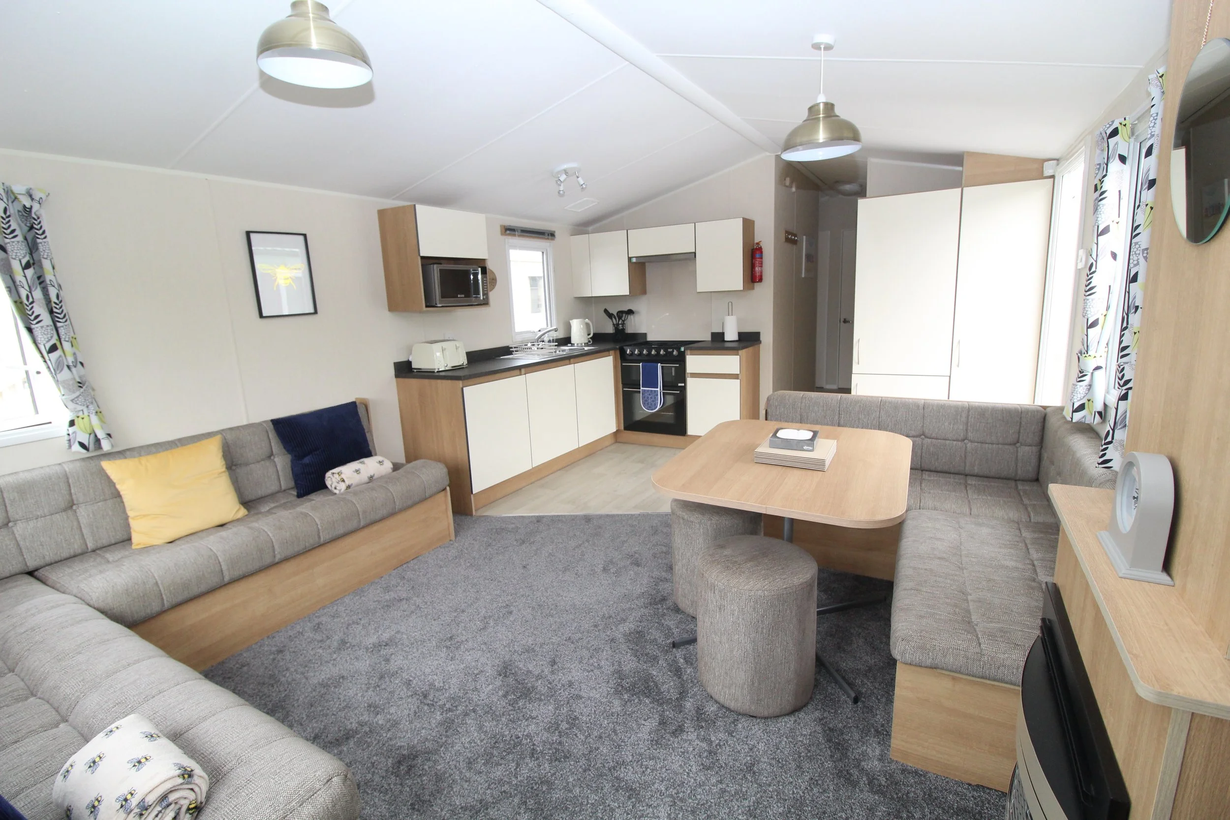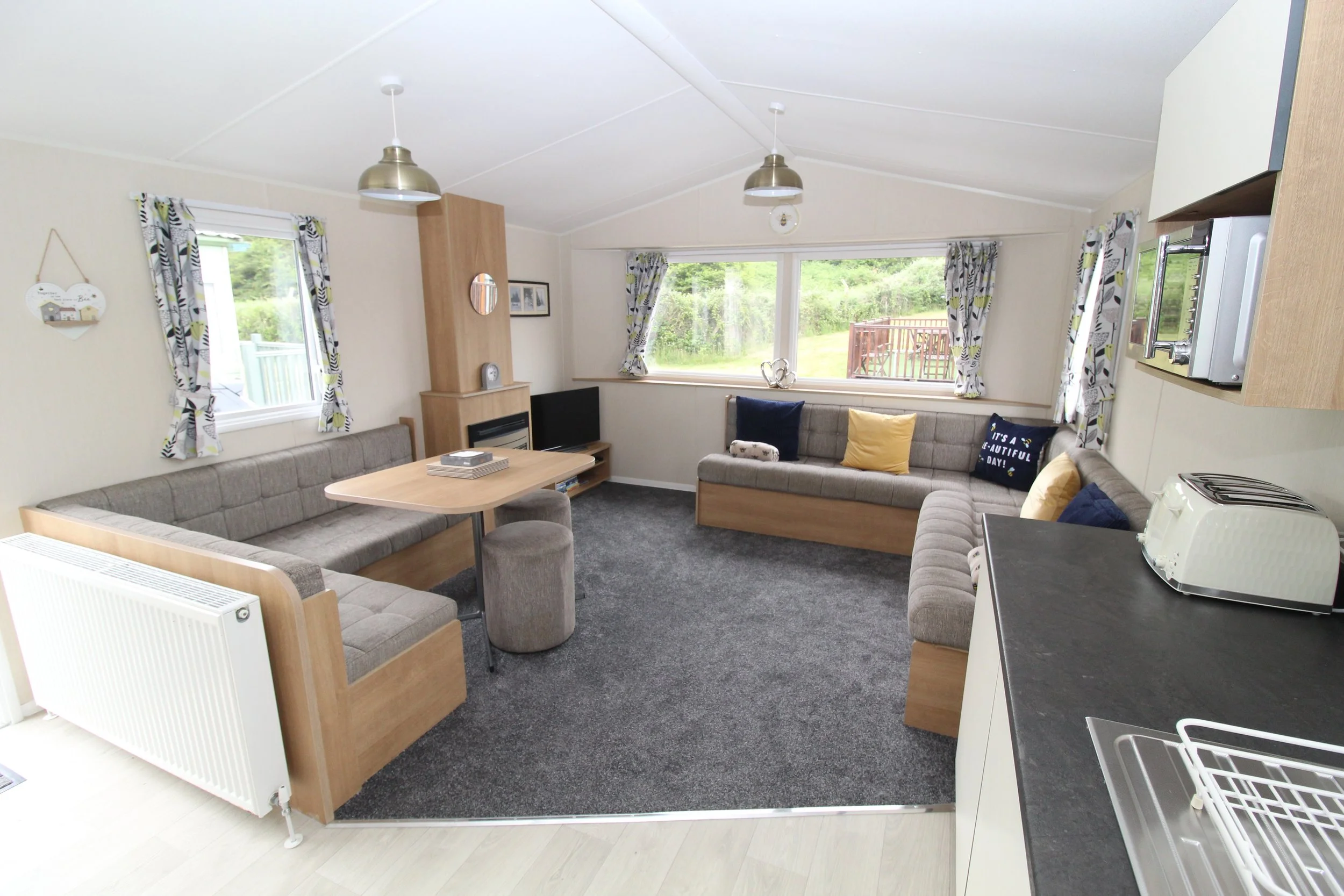 Inside, the living area is spacious and inviting, featuring a comfortable lounge with ‘L’ shaped sofa and separate dining area. It’s the perfect space to unwind after enjoying your day. The lounge area also includes a flat-screen smart TV, DVD player and a gas fire for added warmth. Our aim has been to offer you a home from home atmosphere, allowing you to quickly settle in and enjoy your time on holiday.
